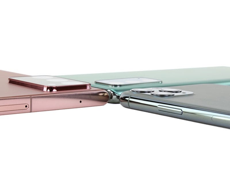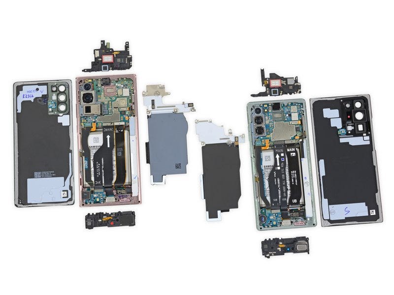 在之前的 介绍文章 中,当时其实已经有一个 5G 频段导致手机内部设计「分化」的典型案例:根据 iFixit 与 JerryRigEverything 对 Galaxy Note 20 系列的拆解发现,三星为不同版本的 Galaxy Note 20 Ultra 设计了两套不同的散热结构:分别是和之前 Galaxy 系列旗舰手机类似的铜蒸气室散热结构,以及另一个采用了石墨烯散热结构的新版本。 这样的散热差异就是为了容纳不同频段的 5G 天线与射频模组做出的设计调整。