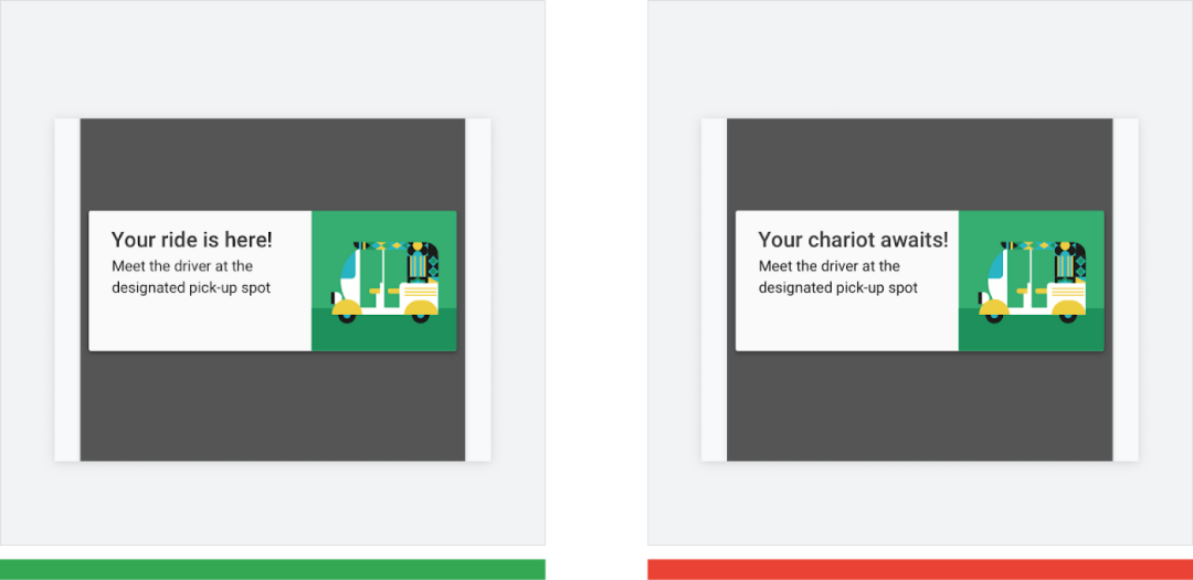 例如,在网约车接近客户所在位置时,网约车应用可能显示 "Your chariot awaits"。对于一个以北美英语为母语的人来说,这句话可能很可爱,但对于在美国境内近 20% 使用其他语言的 用户 ,以及在美国境外使用北美英语的用户而言,这句话就可能变得难以理解。如果波斯尼亚语用户使用翻译软件翻译 "Your chariot awaits",将得到 "Vaša kočija čeka",而不是波斯尼亚语的「您的车辆已就绪」。乘客可能会得到的是「我的双马战车在哪里」这样充满狂战士风格的信息……