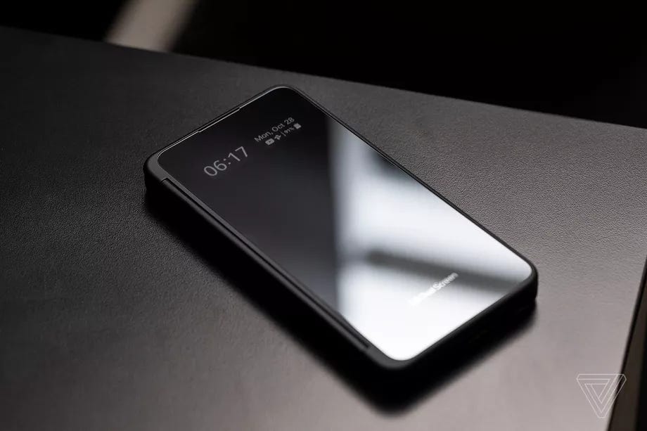 在 LG G8x 发布时,LG 同时为其发布了一款双屏配件:一块与手机主屏尺寸相同的屏幕;副屏与主屏通过 USB-C 接口链接,同时不影响手机的无线充电。