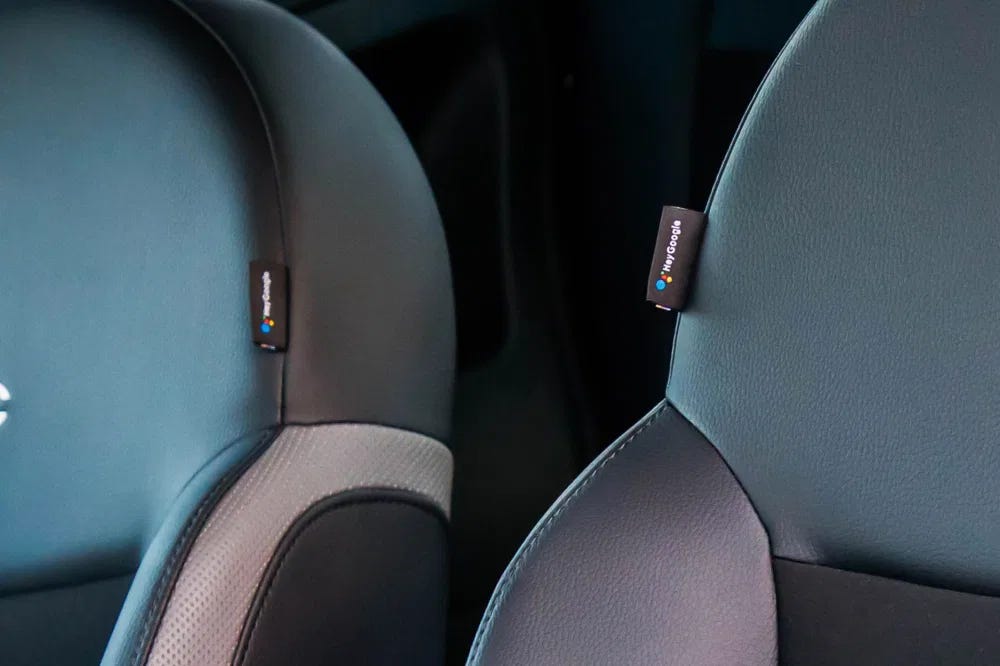 汽车内饰也有同样的元素设计,所有乘客座椅上都有彩色圆点,甚至每个头枕上都有 "Hey Google " 的标签。