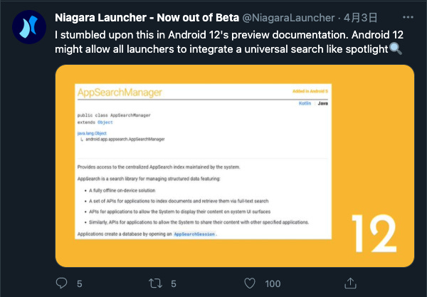 第三方启动器 Niagara Launcher 发推称:Android 12 开发者预览版文档中针对第三方启动器的本地搜索功能进行优化。