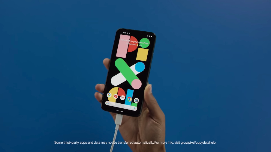 这个视频一开始以非常正常的画面开始:一部连着数据线的 Pixel 5,画外音与画面都是在准备向你介绍「如果将数据迁移到你的新 Pixel 上」。