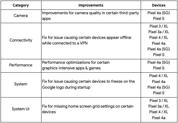 Google 在安全更新文档中介绍:本次更新提升了 Pixel 5/4a 5G 的相机与 GPU 性能,旧款 Pixel 也能获得一定的性能提升;同时还解决了部分系统重启与主屏幕网格设置选项问题。