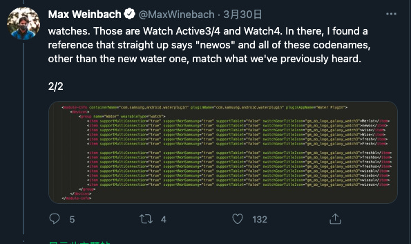同样是本周,Max Weinbach 从新版 Galaxy Watch 配对 App 中,发现了关于新 Galaxy Watch 4 系列的相关代码,其中就有不少提到新操作系统"newos" 的字段,以及可能是 Galaxy Watch 4 与 WearOS 之间兼容层的预开发内容。