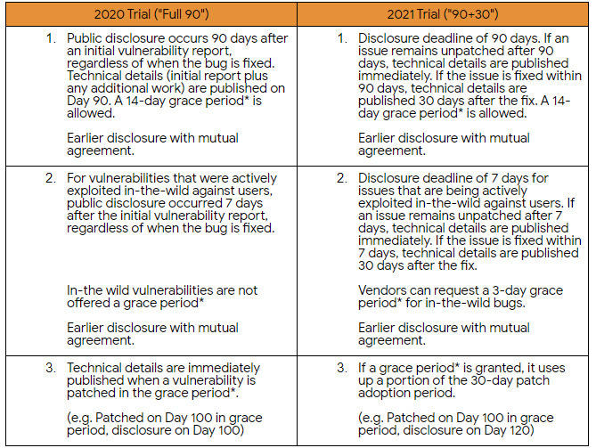 虽然 Project Zero 一直宣称会将这段时间尽可能缩短,来更快地公布相关的技术细节,但现实是 OEM 厂商很多时候都无法在 90 天内将漏洞修复并推送补丁,于是到了 2021 年,Project Zero 团队公布了新的披露计划:现在 OEM 厂商能有 90+30 天都时间来修复系统漏洞,有关漏洞的技术文档会在漏洞被修复后的 30 天之后发布。