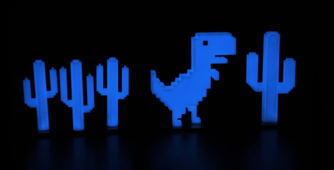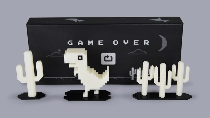随着 Chrome 的普及,「离线小恐龙」也在某种意义上成为了一种文化符号,之前已经有设计师设计出了一款「小恐龙手办」—— 由一块小恐龙以及两个仙人掌立牌组成,售价 24 美元。
