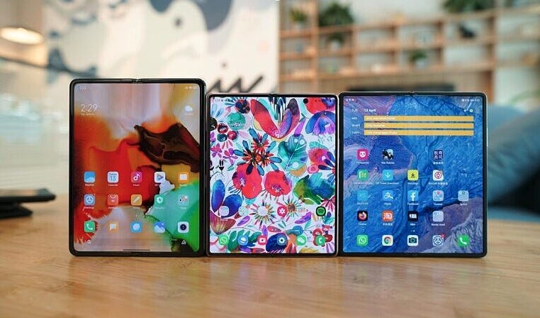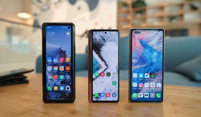说到这个,其实还是先要从当前主流内折式折叠屏手机的问题说起:其实即使是在展开的状态下,目前已经量产上市的折叠屏设备,屏幕尺寸也都只是在 8 英寸左右,单就屏幕尺寸相较于 7 英寸等超大屏手机其实并无太多生产力提升可言。更不用说如今三星、小米两家所推出的折叠屏新机,都为了更加协调的内屏使用而或多或少地牺牲了外屏设计,使其变成较为细长的条状屏幕。