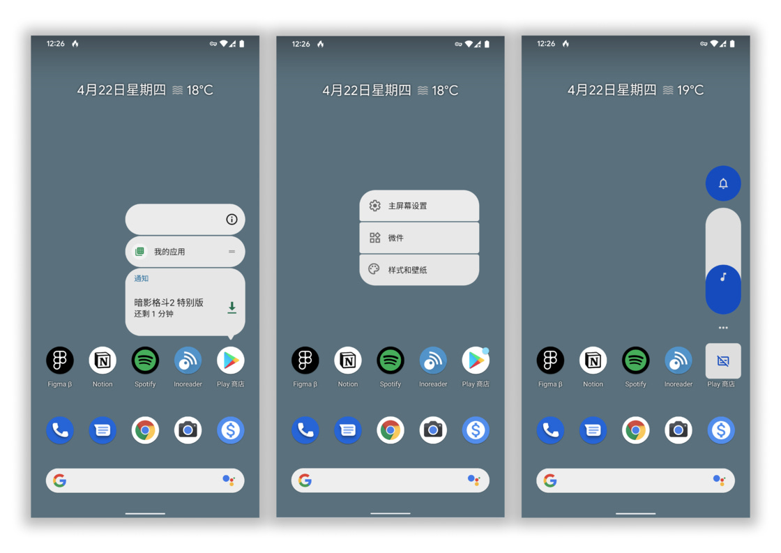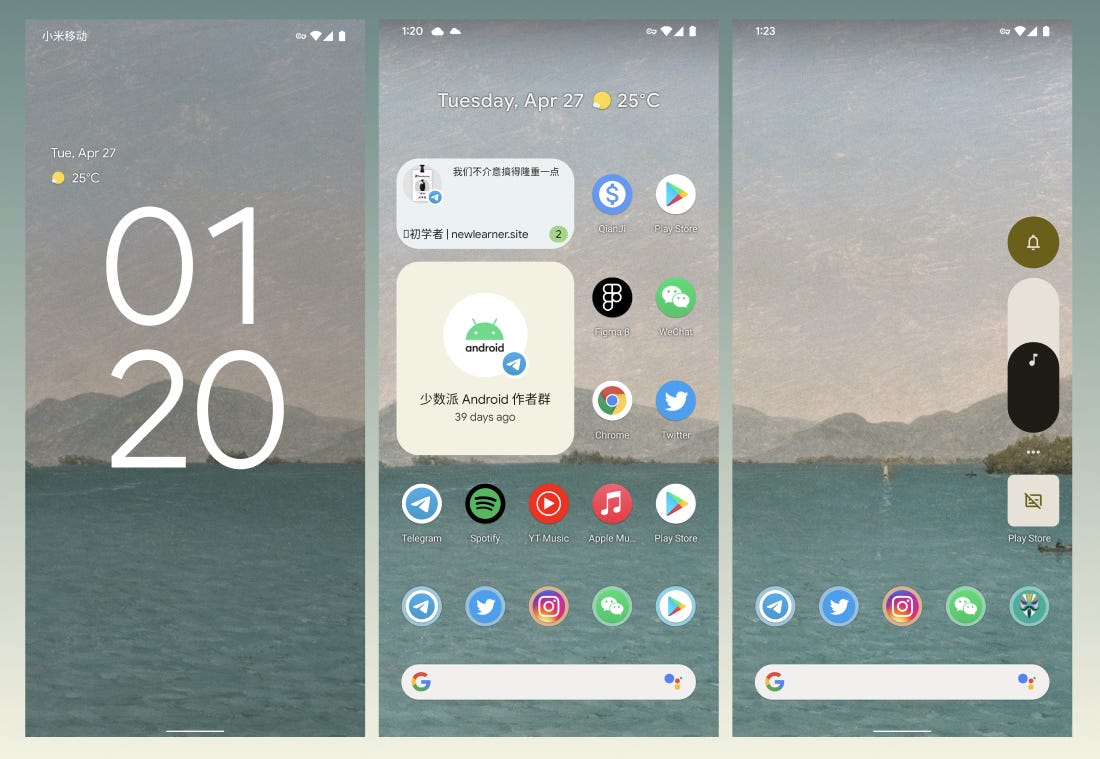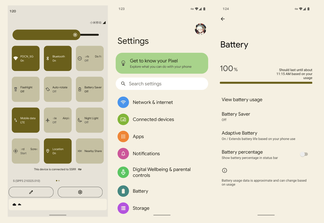 除此之外,不同于 MD 设计为了让 UI 更加美观而采用的不同颜色搭配,Android 12 中新加入的 Monet 主题引擎则是通过新升级的取色算法,从系统主题/壁纸中选择主题色,通来全局应用到几乎所有背景中,辅以渐变/毛玻璃等效果。在完全体的 Android 12 DP3 中,我们已经能看到这个主题引擎正常运行时的部分效果。