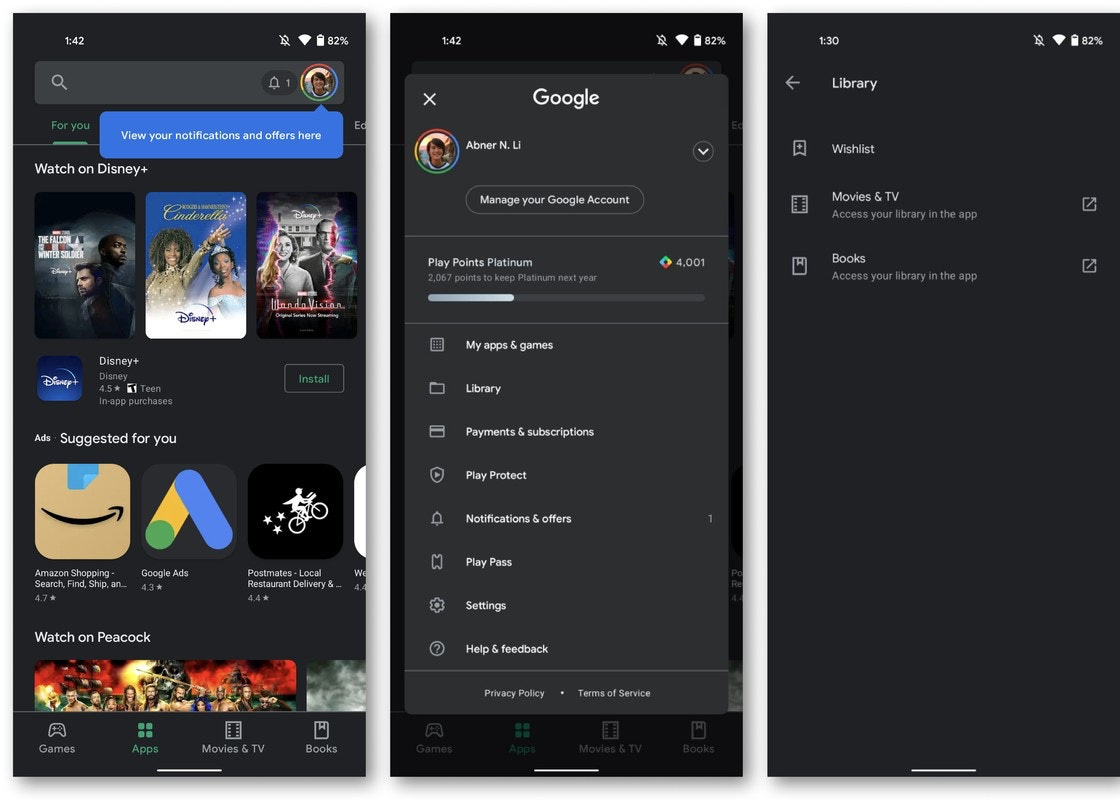 更让人印象深刻的是,这个问题 Google 直到 2021 年,才通过一种破坏设计规范的方式解决:将 Play Store 的 侧边栏内容完全通过一个二级菜单的方式加入,这也在很大程度上代表着 Google 内部对于 MD 设计的下一步方向其实是处于一个相当混乱的状态,而来自 2014 年的 MD 设计已经在全面屏、异形屏乃至超长比例屏幕等新形态设备与内容形式的变化面前已经老态尽显。