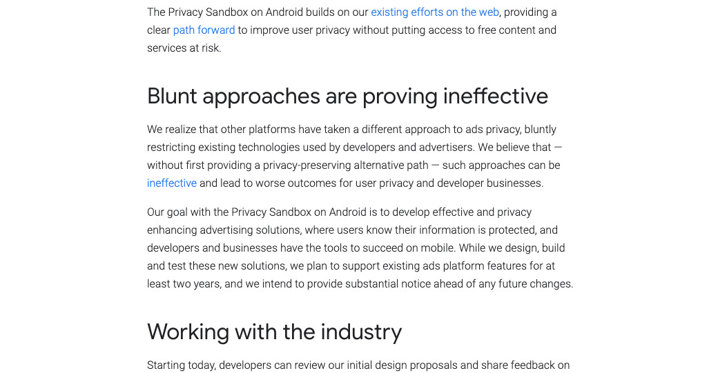 就技术上来讲,隐私沙盒会是一个比现有情况能更进一步保护用户数据隐私、同时不会过于扰乱现有广告业生态的方案,但最终 Google 能否在 Android 与广告商/开发者达成协议并发布最终版本,仍然有着很多变数。