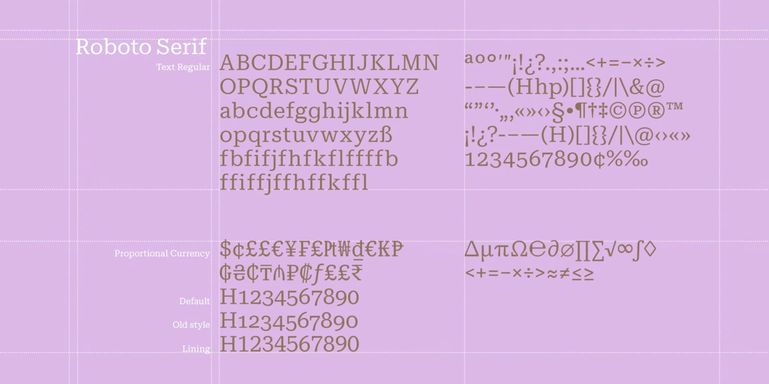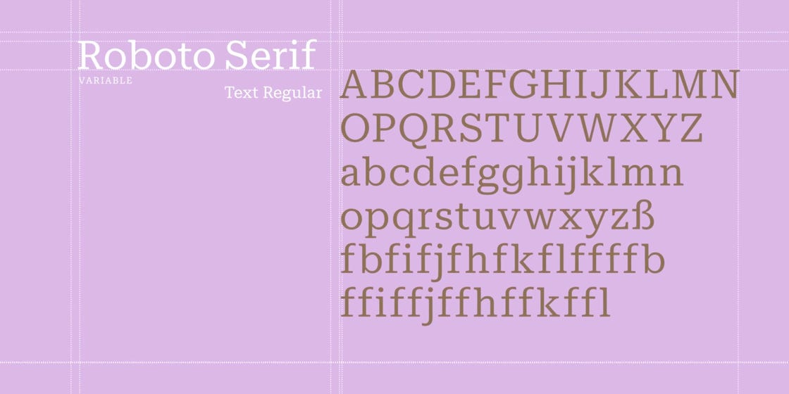 Roboto Serif 有三种不同的宽度样式,与 Roboto 其他大多数字体一样为衬线体,并且同样为可以任意商用,你可以在 Google Fonts 网站下载到它并随意使用。