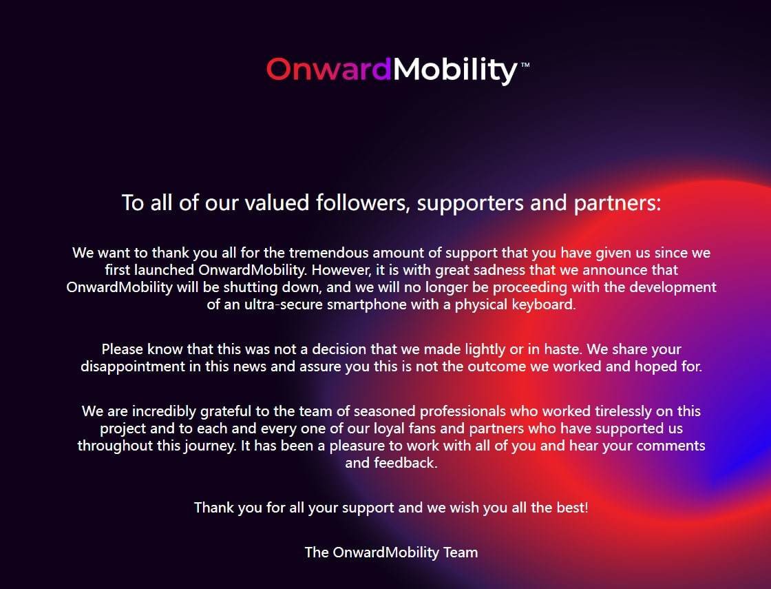 由于诸多不可抗因素,加上 BlackBerry 品牌授权协议到期,OnwardMobility 正式宣布放弃研发 5G 版本的全键盘黑莓品牌手机。