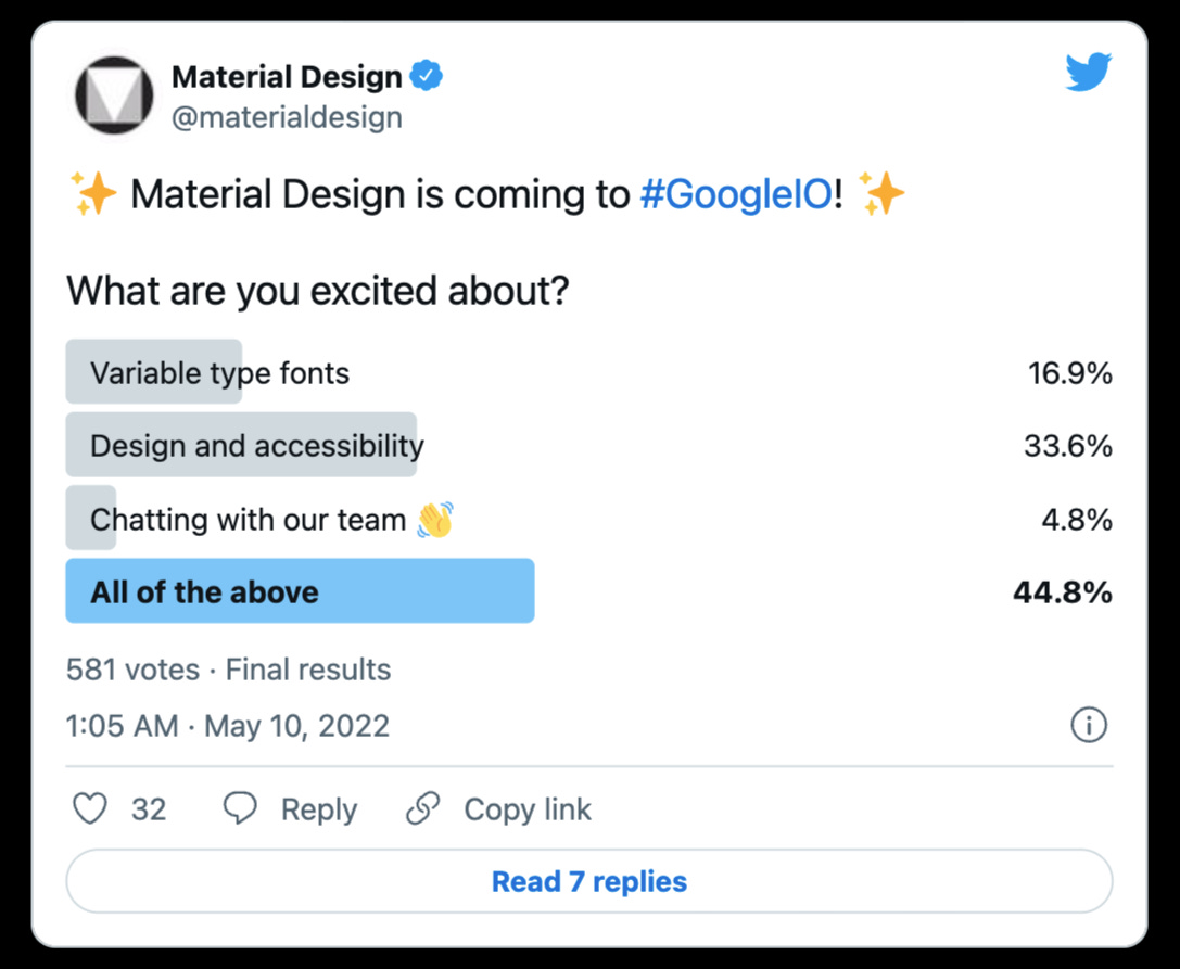 稍早前 Material Design 官方 Twitter 也曾发起过一个关于会在 I/O 期间值得期待的新功能投票,其中可变字重字体同样也在选项之中。