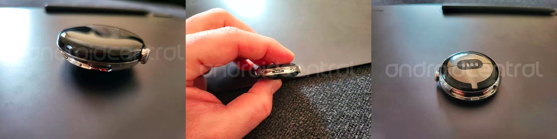 直到进入四月,Android Central 首先拿到了据信是 Pixel Watch 的原型机(原文中关于这个设备的来源是「被遗落在一个餐馆中」),并展示了包括极简的外观设计/表冠等信息。