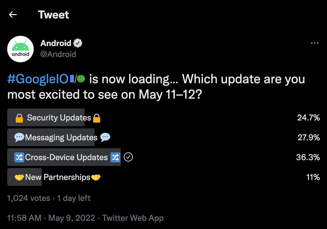 相比往届 Google I/O ,关于泛 Android 智能生态的补充同样已经是众所周知但同样期待度很高的软件更新部分:Android 在 Twitter 上同样有一个关于 Google I/O 期间会发布新功能的投票,其中有 36% 的投票选项给了「跨设备体验改进」(Cross-Device Updates)一项。