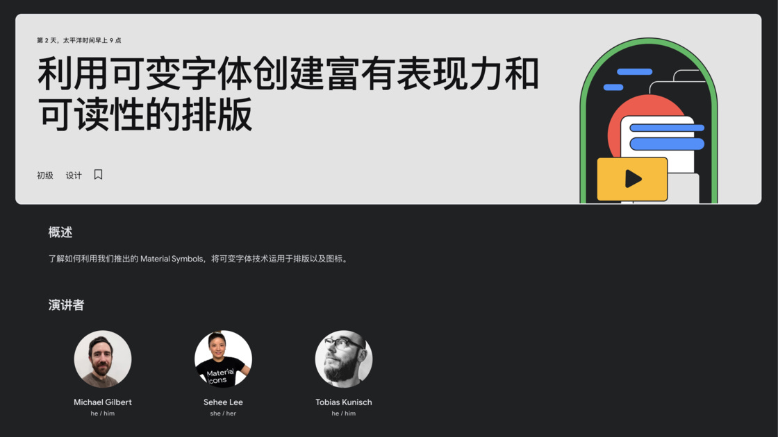 近期 Google 同样发布了十二级可调字重的 Roboto Flex、在 Google I/O 主题演讲的日程表中找到对应的环节。